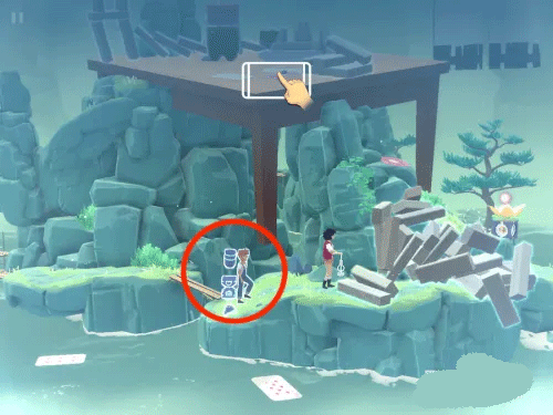 1、第一小节中我们先直接往前走,这时候会有一个【灯座】从栅栏跳到箱子,再跳到主角经过的位置上。我们让A把提灯放到【灯座】上返回,【灯座】也会跳回去,在【灯座】在跳回箱子之前会触碰到黄莲花的亮点,这时候继续前进拿走点亮的提灯。[注意到达黄框位置”点击”黄框出现木板才能继续前进]