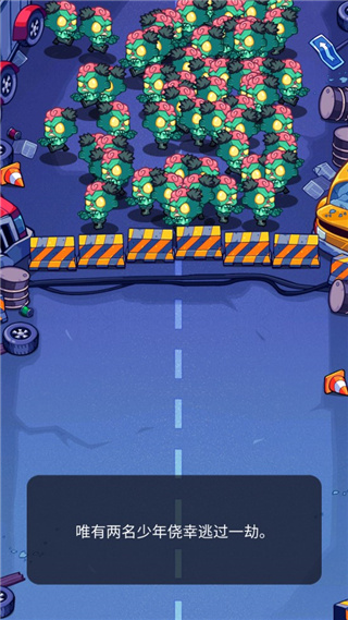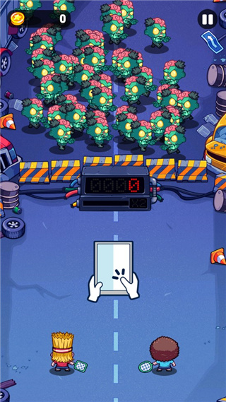 我们可以看到对面有着一堆的僵尸,在隔离带的那一方蠢蠢欲动,随时想要突破隔离带的防护冲过来的样子,然后我们的任务呢,就是操纵着图中的两位英雄攻击僵尸们。