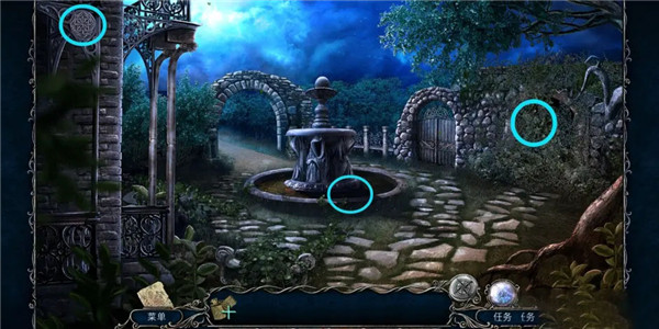 3、进入花园点击左上角的建筑花纹达成3/22成就【侦探】,接着拿走喷泉池里的「铲子」,然后再拿走右边藤蔓上的「干苔藓」。