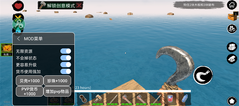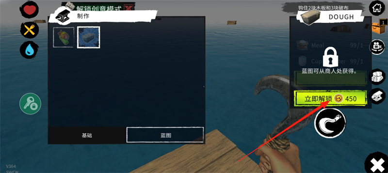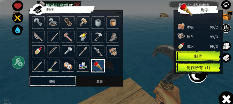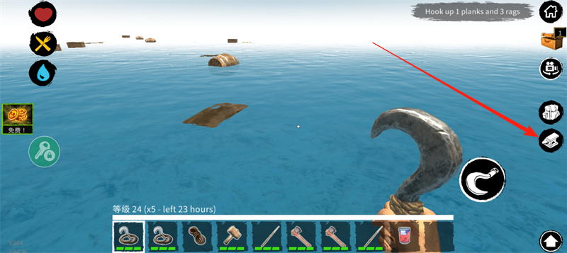 3、可以用钩子勾住海洋上的漂流物获取资源,然后使用这些物资制作有用的工具和加固木筏。