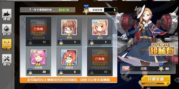 每个服务器都可以进去看一下 这里推荐有“光辉”的服务器 ,“光辉号”是目前最强航母,推图和PVP(竞技)都有非常好表现,如果选在有兑换的服务器,可以用80勋章兑换(蓝卡退役1勋章、紫卡退役4勋章、金卡退役10勋章最好不要退役金卡会败人品) 前期通过3-4天抽卡和地图掉落80功勋是没问题的(我的区暂时是胡德,只能截屏胡德了最喜欢的立绘,但这个金卡的兑换在7天后会刷新,所以在没有光辉的区也没关系,下次刷新就是光辉也说不准呢)