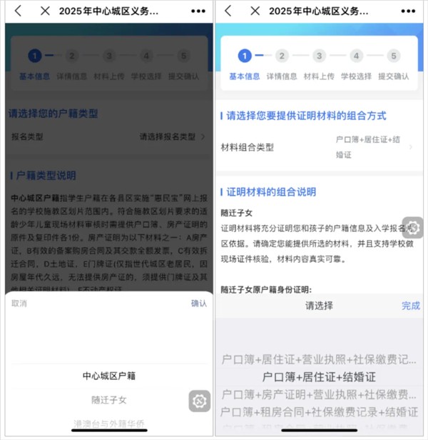 4、点击“请选择户籍类型”后,会出现三种报名类型(中心城区户籍、随迁子女、港澳台与外籍华侨),选择自己相应的报名材料组合类型,点击“下一步”。