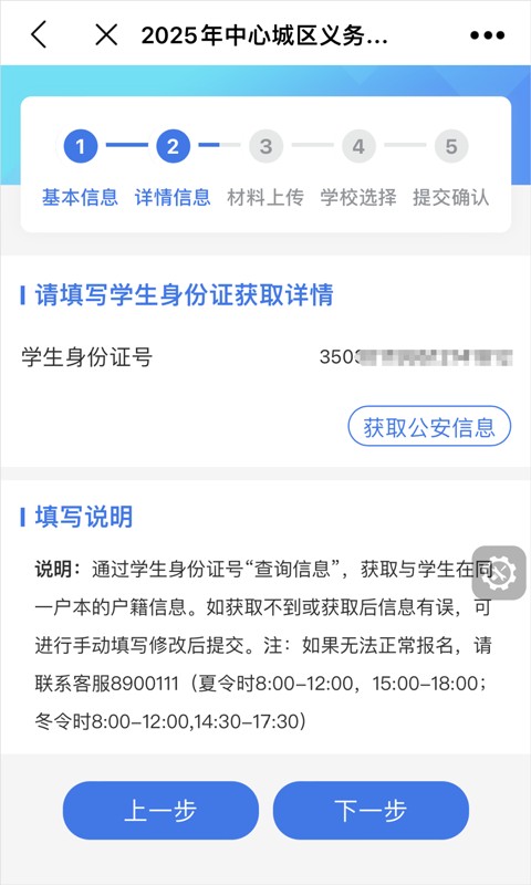 5、如自动获取学生信息后,可以选择同户学生,然后点击获取公安信息,如无获取到学生信息,请手动输入学生身份证号后,点击获取公安信息,进入下一步。