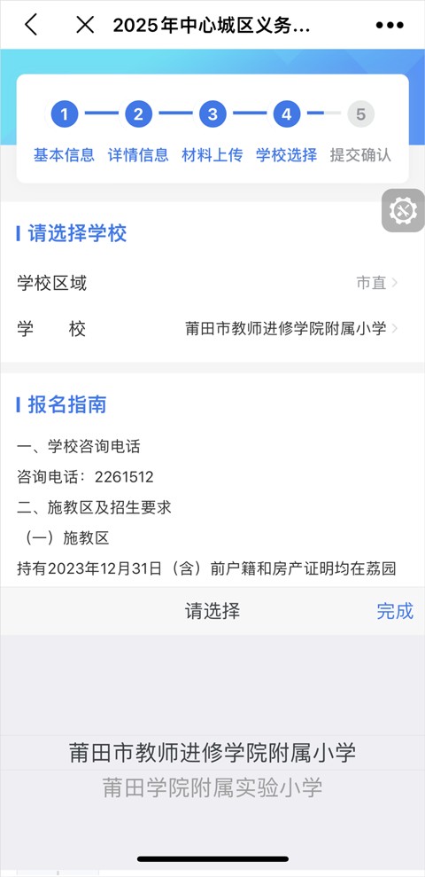 8、选择报名学校所在的县区,市直、城厢、荔城、涵江、秀屿、仙游、湄洲岛、北岸,然后选择对应的学校,同时可查看该校的招生政策。