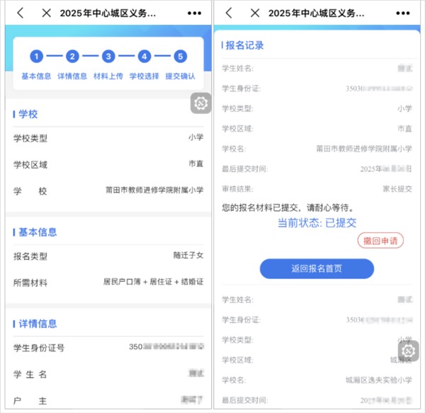 2、进入后可选择“小学报名”“中学报名”,点击“立即报名”后,按照提示进行人脸识别,报名提交成功后可在页面中“个人中心—我的记录”查看自己提交的报名记录和审核进度。