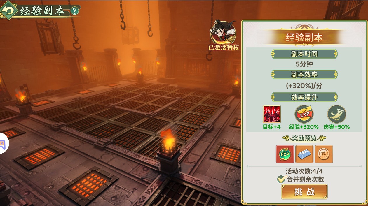 每天可以进行三次经验副本挑战,如果购买特权,则每天可进行四次经验副本挑战,千万不要错过了。