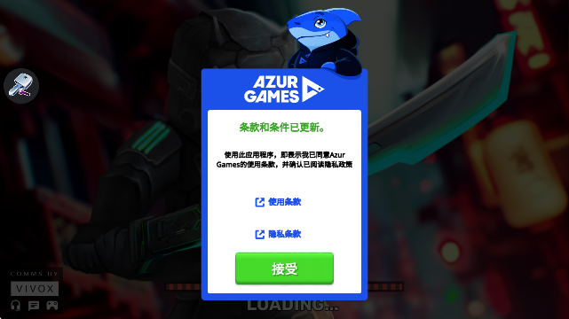 进入到游戏开始界面。如图所示。请接收使用条款和隐私协议。