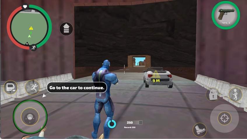 1、游戏中的图标和按钮功能,左边从上到下可以看到地图、奔跑、移动等按钮,右半从上到下分别是显示能量、血量、上车、跳跃、绳索、攻击、脚踢,除此之外用手指滑动屏幕还可以控制视角。