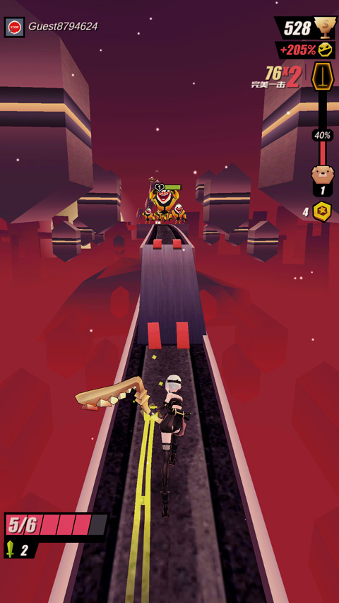 1、基础玩法:游戏中「跑酷」是一项基础的常规操作,你要负责做的就是,上跳下窜、左躲右闪,除了躲避障碍物以外,还要对沿路上攻击拦截你得小丑们,重磅出拳击垮它们。