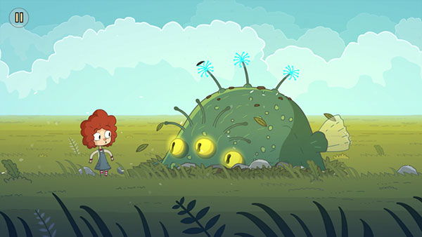7、继续向右,三个花朵点亮出现三只眼怪兽,点击它,小女孩会抚摸它。