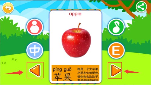 4.浏览学习:在卡片页查看苹果等水果的图文信息,滑动切换学习不同水果。