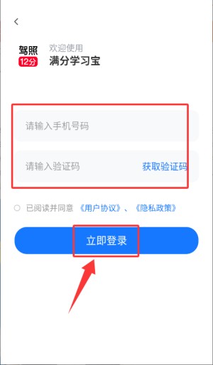 输入手机号并获取验证码,填写后勾选用户协议,点击“登录”进入主界面。