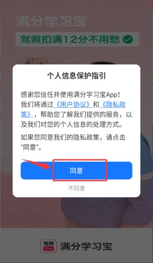 首次打开满分学习宝App,在弹出的个人信息保护指引窗口点击“同意”。