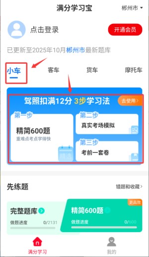 在首页找到“小车分类”,点击进入后选择“精简600题”学习模块。