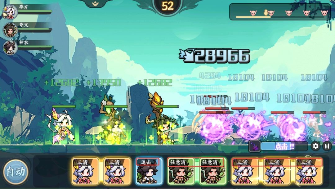 不过没关系,在游戏初期我们就提供了自动战斗的功能,会根据“凑三消”的原则自动进行消块,足够应付大多数战斗了。