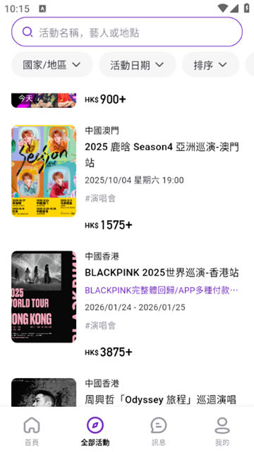 打开App,首页输入目的地/活动名,选择日期,筛选票价或座位等级。