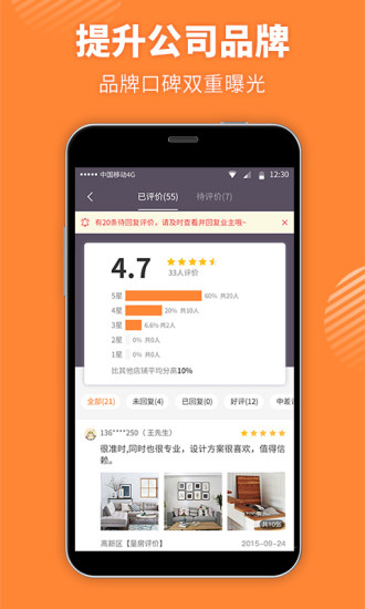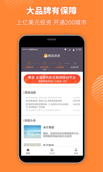 1.海量订单资源:惠装网超2000万业主用户为商家提供稳定订单来源,手机接单便捷高效。