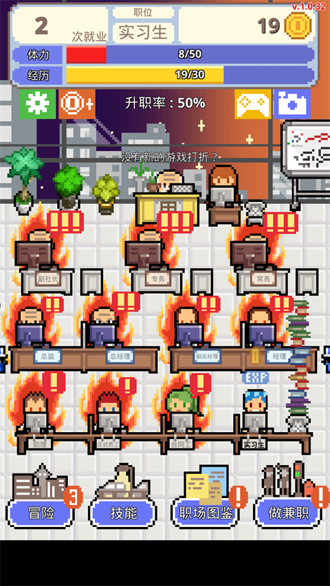 职场保卫战官方版是一款像素风开罗职场养成游戏。玩家将历经上千职场岗位,从失业、面试失利到成为公司社长。靠工作佣金升级业务、口才等能力,从实习生起步努力争取机会。严苛岗位下,要与上司周旋、参加社交活动提升升职率。游戏剧情丰富,通过接取工作、判定剧情保障职业空间,还能提升技能获更高属性,快来体验!