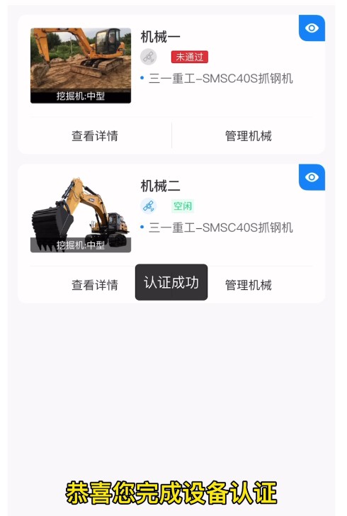 在认证页面点击右上角「+添加」按钮 → 选择您的机械类型(如挖掘机、装载机等)。