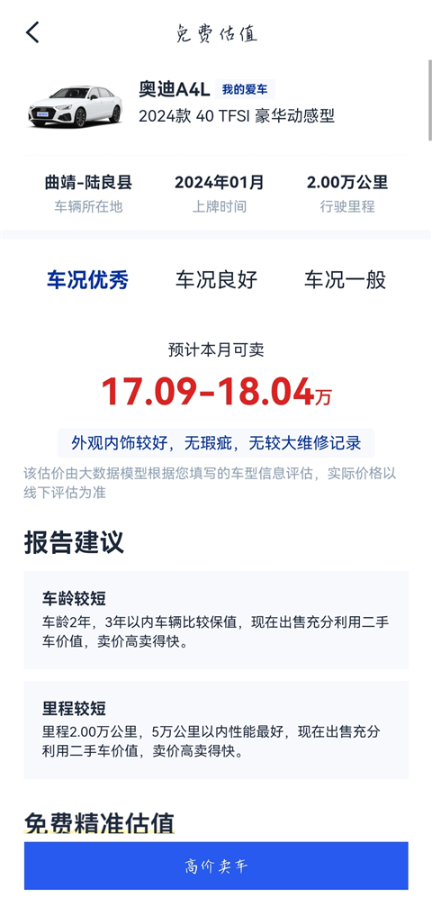 5.输入手机号并提交,即可查看详细估值报告(含市场均价、车况调整建议等)。