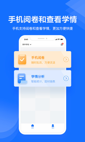 登录后直接进入主界面,主要功能包括【手机阅卷】和【学情分析】。