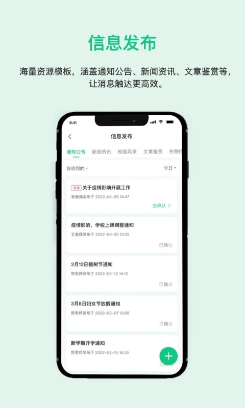 通知公告:提供海量通知模板,一键发布至手机锁屏,保证消息及时触达。