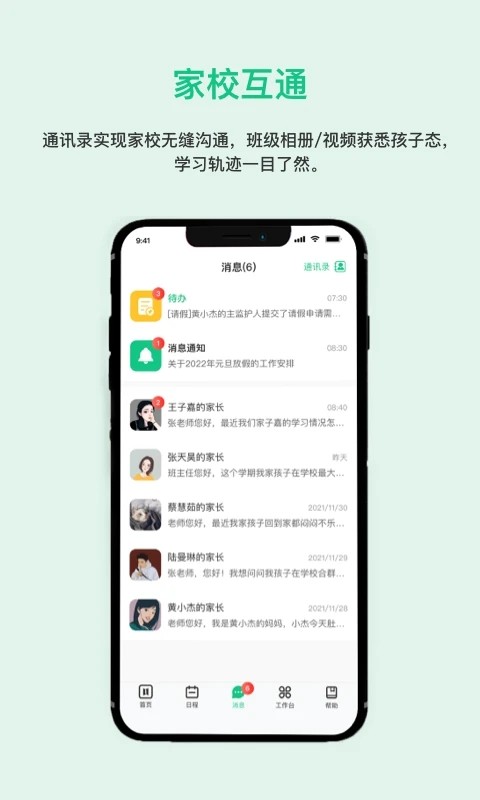 考勤管理:在“考勤”模块,实时查看学生到校情况,家长可收到异常提醒。