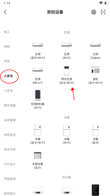 在添加设备界面,浏览支持的设备列表,选择你要连接的家电类型(如移动空调、扫地机器人等)。