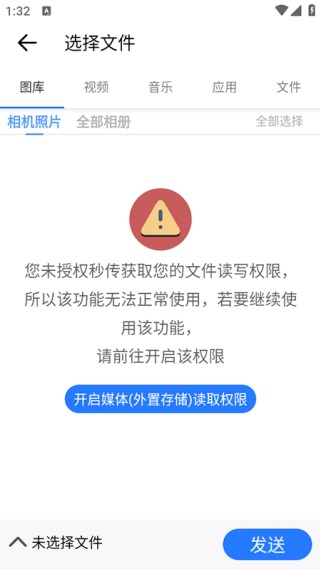 要是你想把文件分享给别人,就点击“我要发送”。进入文件选择页面后,这里就像一个分类整齐的文件仓库,有图库、视频、音乐、应用、文件等不同类别。你可以根据自己的需要,从这些分类里挑选要发送的文件,而且还能一次选好几个,就像在超市购物时可以同时挑选多种商品一样。选好文件后,点击“发送”按钮,接着就耐心等待接收方来连接。