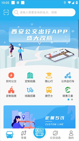 1.开启西安公交出行App,蓝色主界面映入眼帘,顶部智能搜索栏随时待命。