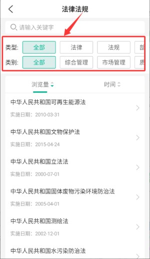 3.在界面按分类筛选查看具体法律详情,如“中华人民共和国可再生能源法” 。