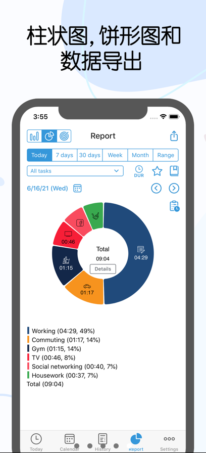2.可视化报告:生成条形图、饼图统计图表,按日期/标签/任务过滤数据,支持CSV/PDF导出。