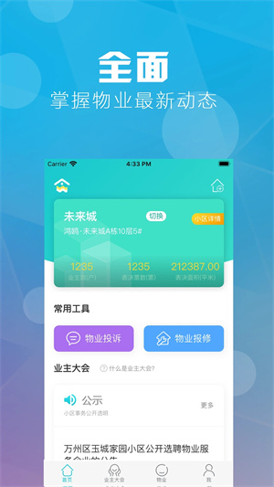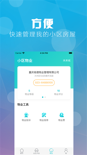 1.物业全流程管理:支持在线缴费、报修提交、进度追踪,资金流向透明可查。