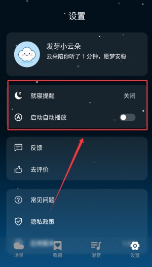 4.个人设置中心能设就寝提醒时间,还能开关自动播放功能,帮你规律助眠。