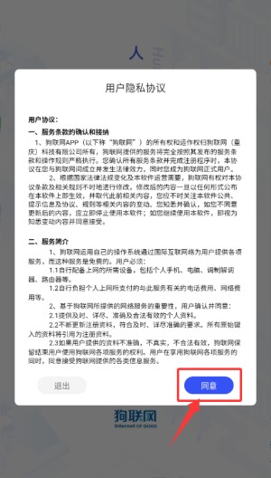 1.打开狗联网 app,先点“同意”用户隐私协议进入应用