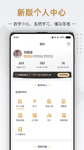 系统化学习:在EMBA课程区按主题学习完整课程,支持倍速播放与后台收听。