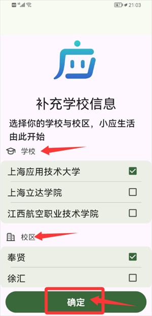 2.在补充信息页选好学校和校区,点确定。