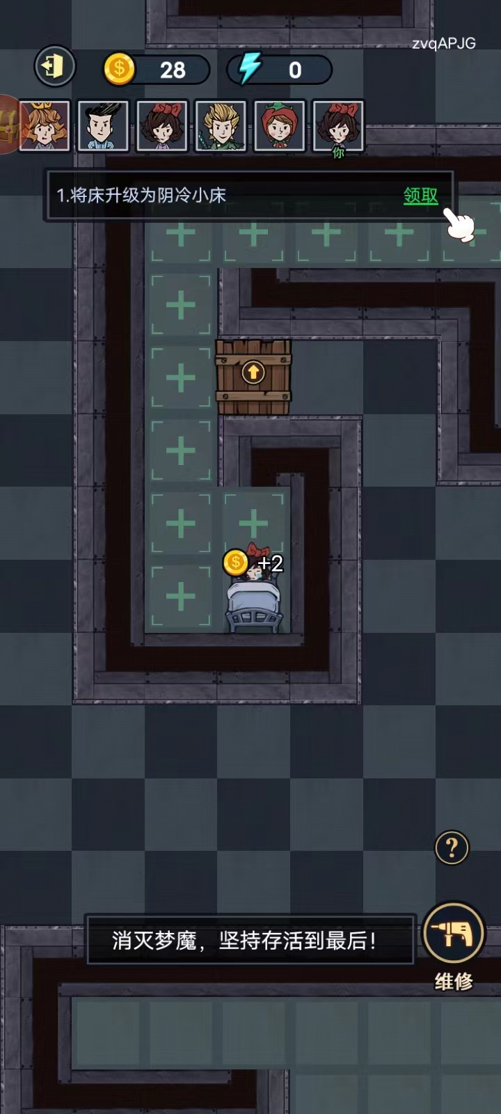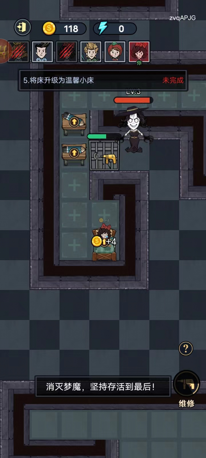 1. 玩家在宿舍找空房,巧妙建防线抵御梦魇持续攻击。