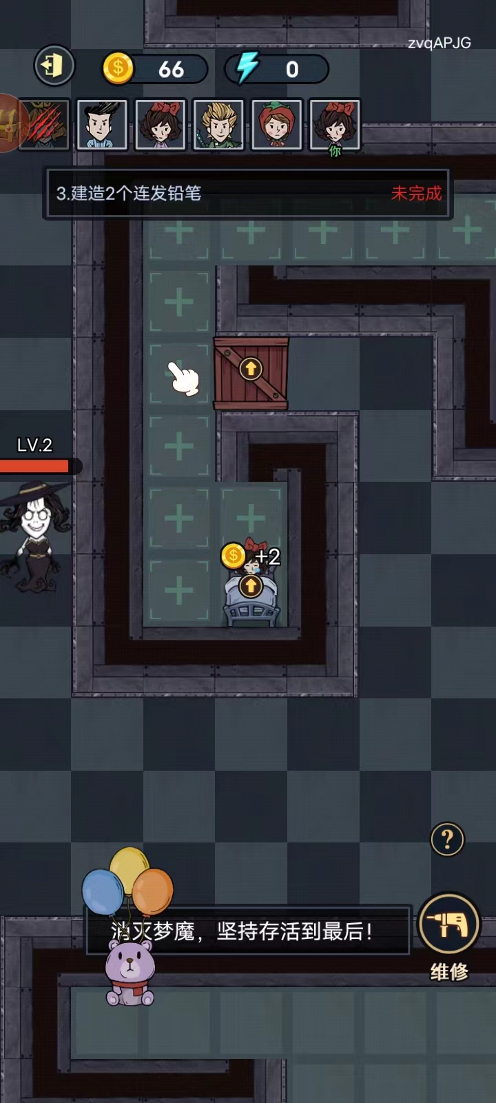 7、点击房间的空地,可以建造连发铅笔或者老式发电机;建造老式铅笔可以在梦魇来的时候攻击它;由于随着游戏的进行,梦魇也会越来越强,因此玩家需要不断升级老式铅笔以及大门以击退梦魇;