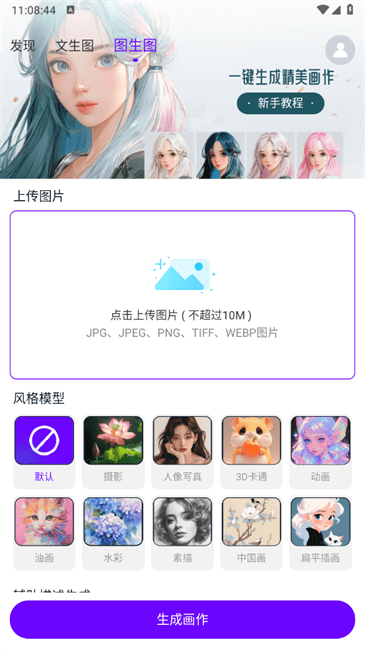 6.图生图创作:在图生图板块,上传JPG、JPEG、PNG等格式的图片生成作品。