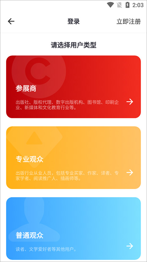 1.下载安装 bibf 云书展 app 到手机,打开后注册登录,有参展商(出版社等机构)、专业观众(出版社行业人员等)、普通观众三种注册登录身份,按普通观众身份注册登录即可。
