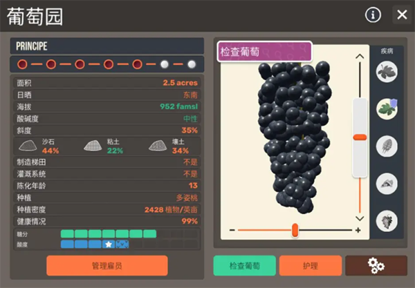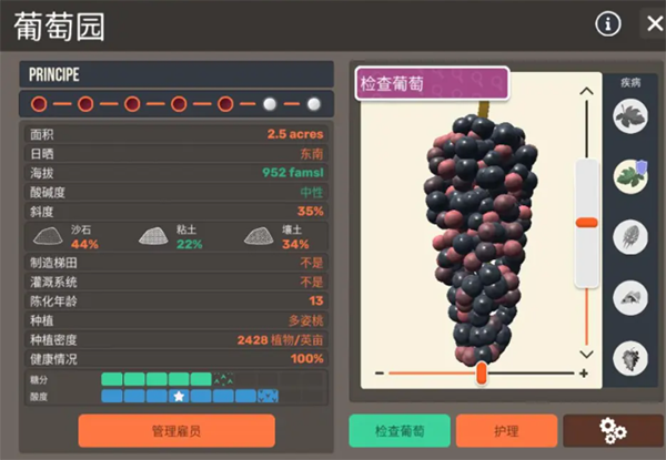 葡萄生长受土地特性影响。开始种植的选址决定了葡萄品种品质。其中土地特性分为海拔高度、土壤酸碱度、土壤成分(砂土、黏土、壤土)游戏中每块地的游戏特性会用三种颜色衡量,绿色》 橘色》红色)。 选址时尽量选择该品种下有至少2项绿色数值的土地。