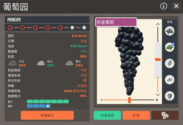 所有葡萄品种的收获时间都需要游戏理解追求那个完美的平衡。有时候植物护理满了或者有极端天气,收获时间就要酌情提前或者延后。可以根据游戏给出糖度和酸度的提前一天变化值来灵活操作。