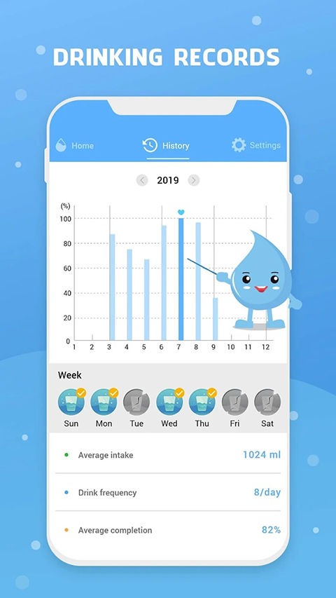 2.旁边能查看每周完成情况,下滑还能看每周、每月的喝水情况。