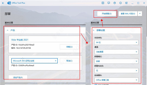 3、在 “基础设置-产品” 选项选择所需的应用,“部署设置”中的体系结构根据电脑位数选择,部署模式选择“下载时安装”,安装模块选择OfficeToolPlus