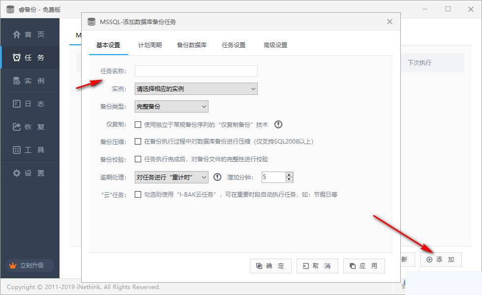 2、支持任务设置功能,可以在这里添加新的数据库任务,也可以点击右侧的“文件”类型添加备份,