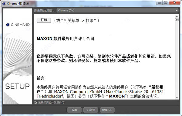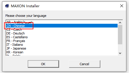 2、进入C4D R19 Win文件夹,双击MAXON-Start.Exe开始安装软件,选择Cn-Chinese为简体中文;