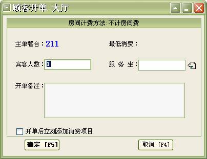 来宾登记→顾客开单:每个客户发生消费前必须进行登记(建立客户帐),给客户安排一个房间(餐台)等房间项目,房间项目必须是在“系统设置”模块中的“房间项目”中已经设置,系统只能对已设置的房间项目(餐台)进行登记。