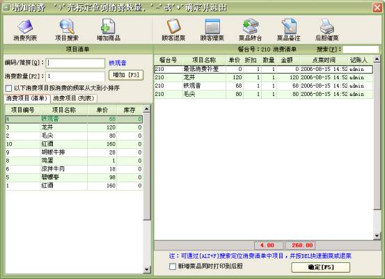 点单消费→增加消费:客人在消费过程中所消费的所有项目均要进行入帐处理,以便在客人离店时自动计算消费额。客人的消费明细便是在此入帐。