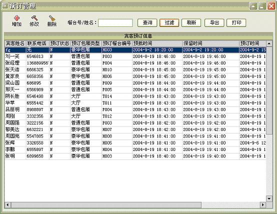 查询预订:在预订管理窗口中“餐台号/姓名”后的文本框中输入被预订的餐台号或预订人的姓名后点击“查询”,数据表中将显示出符合查询条件的预订信息,当然可以点击“过滤”按钮选择过滤条件从而指定查询范围。点击“刷新”按钮数据表中将显示所有预订信息。